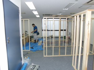 ![]() | マッサージ店ということでいくつかの個室が必要になります。まずは個室の間仕切りづくり。設計した通りの位置、高さ、幅で壁となる部分の骨組みを作っていきます。 |